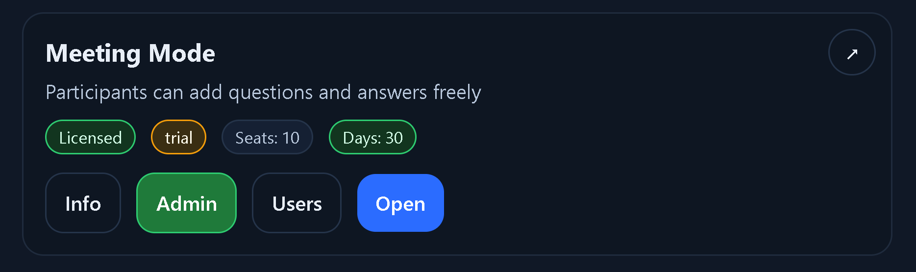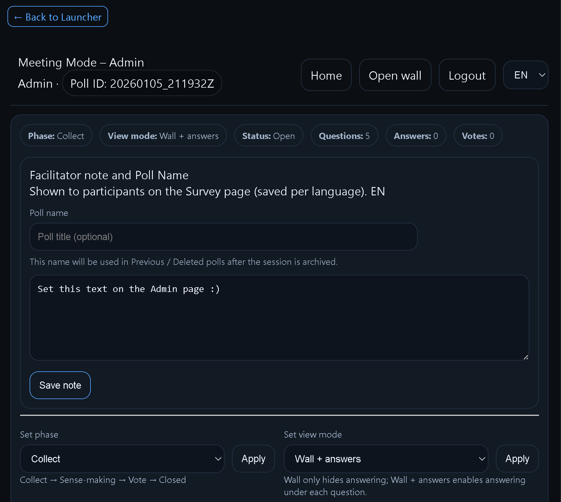 Use Info for help, Admin for setup, Open for entry. Admin is your facilitator start point.