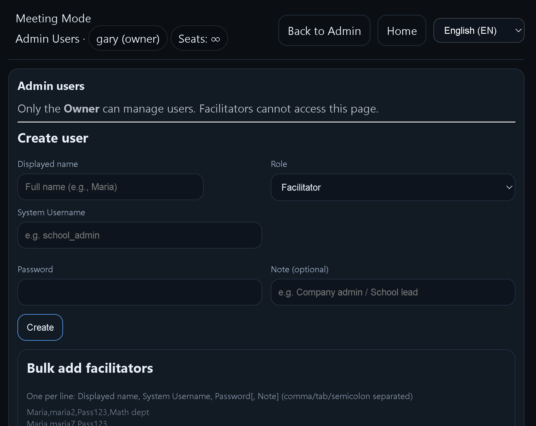 Owners add/disable facilitators in Admin → Users (where applicable).